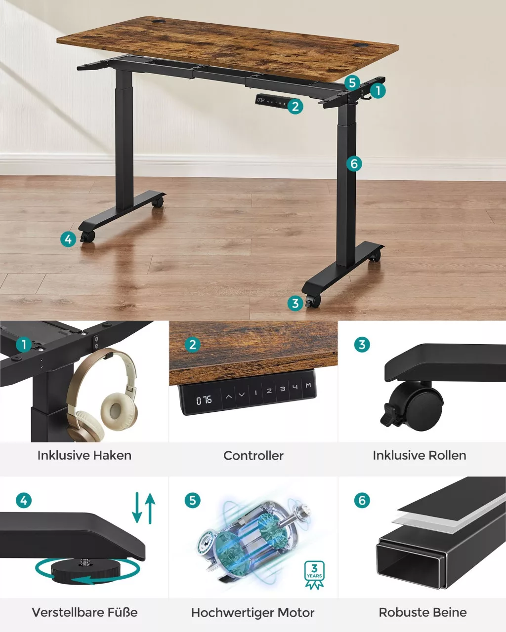 SONGMICS Állítható Magasságú Elektromos Íróasztal Vintage Barna-Fekete