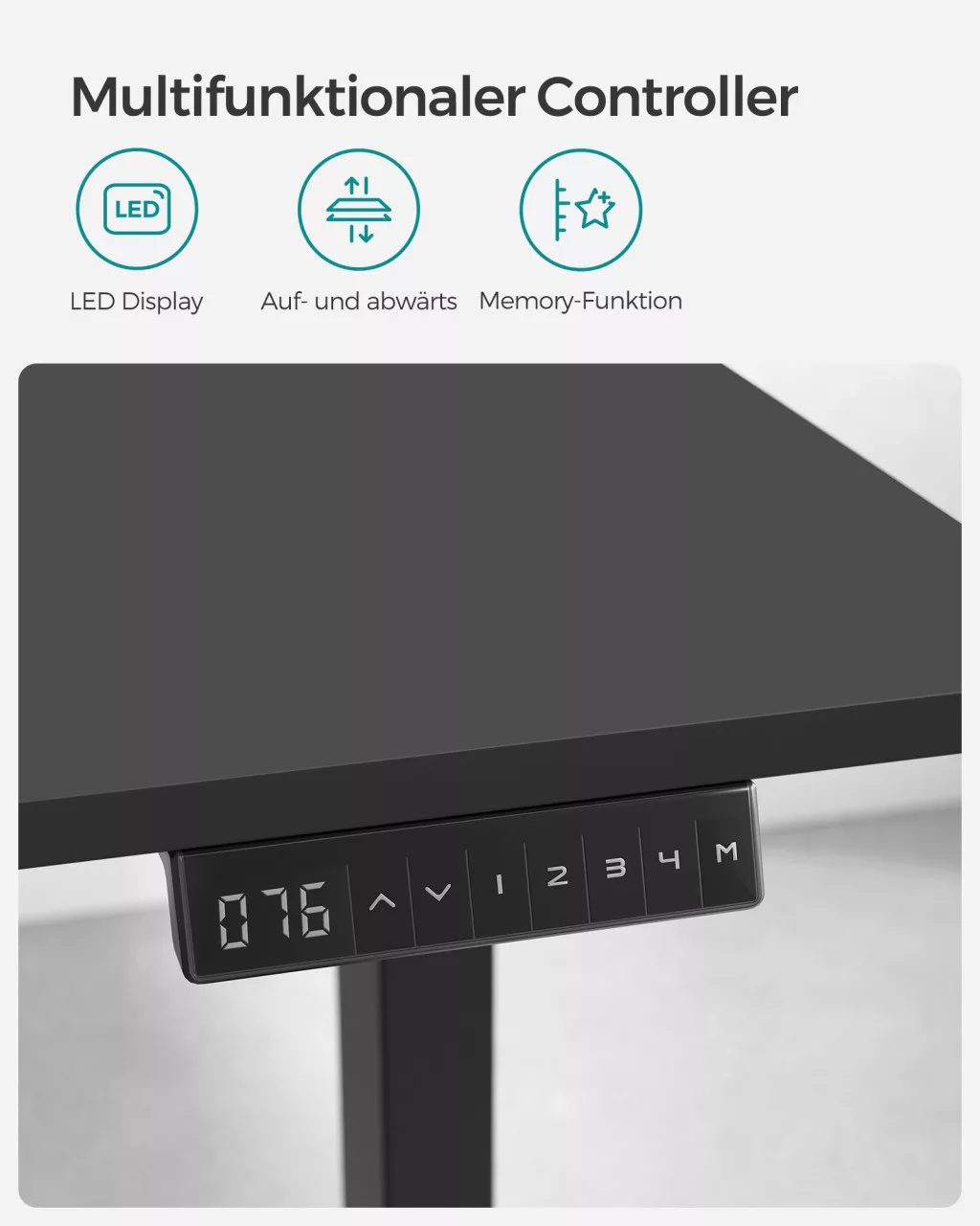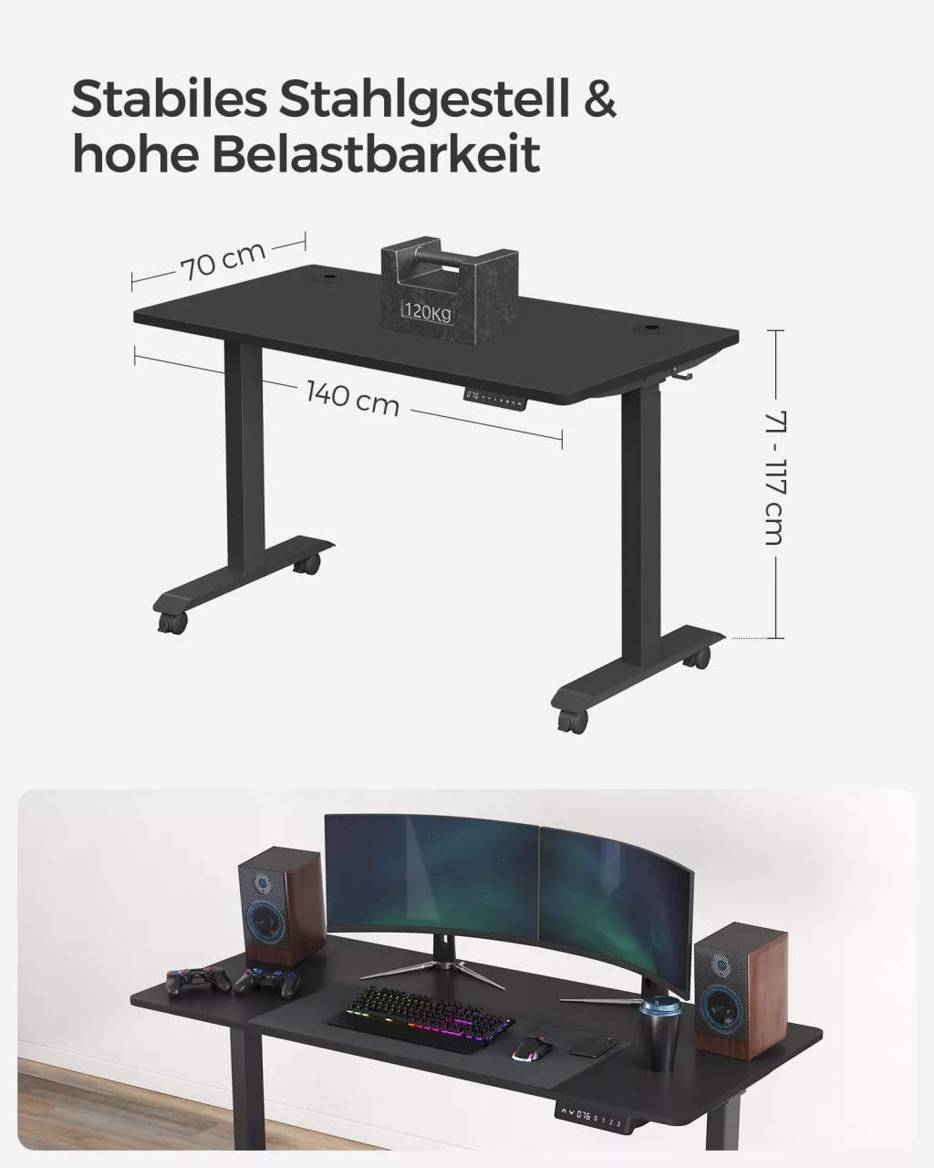 A masszív, 70 x 140 cm-es asztallap és a 120 kg teherbírású váz hosszú élettartamot garantál. A beépített memória funkcióval 4 kedvenc magasságot menthet el, az automatikus ütközésvédelem pedig növeli a biztonságot.