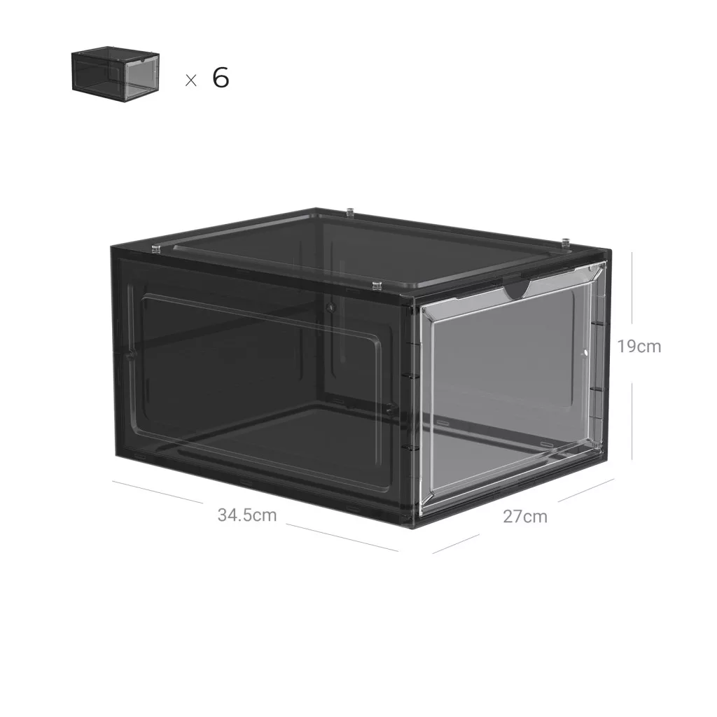 Praktikus, 6 darabos cipőtároló doboz szett átlátszó ajtókkal, amely tökéletes megoldást nyújt a cipők rendszerezett tárolására. A dobozok egymásra és egymás mellé is helyezhetők.