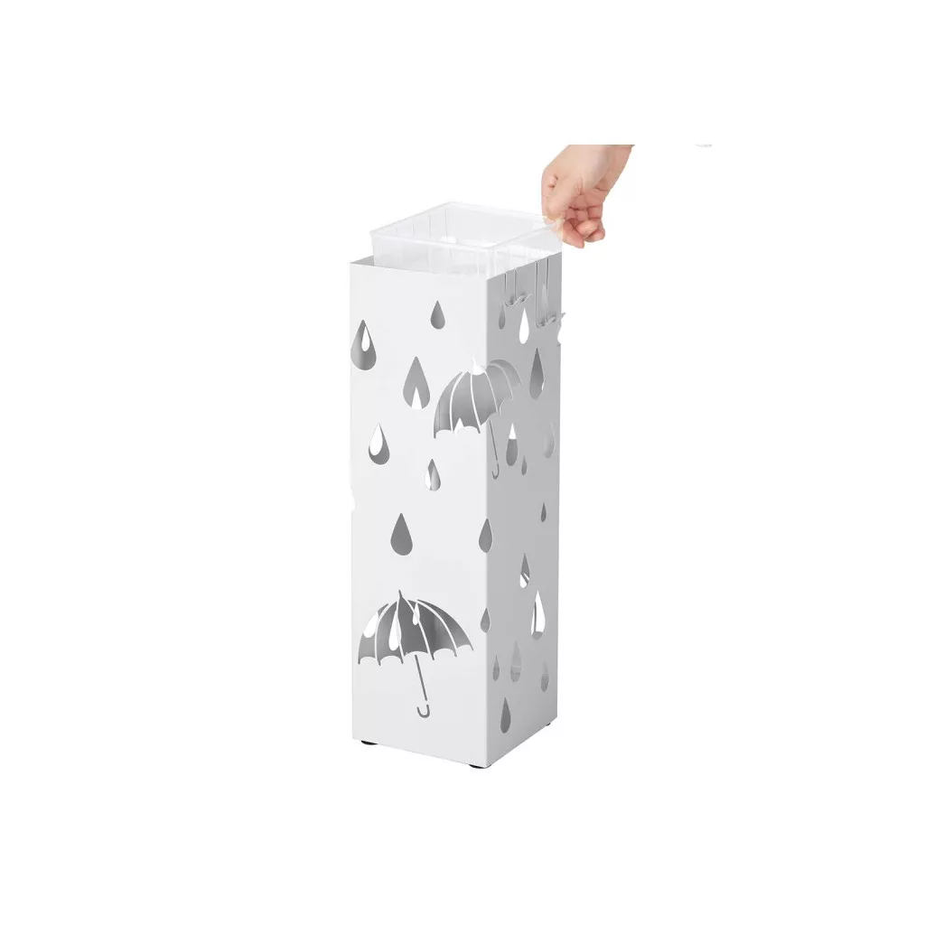 Stílusos fém esernyőtartó eső mintázatú kivágásokkal, csepptálcával és praktikus akasztókkal a tökéletes előszobai tároláshoz.
