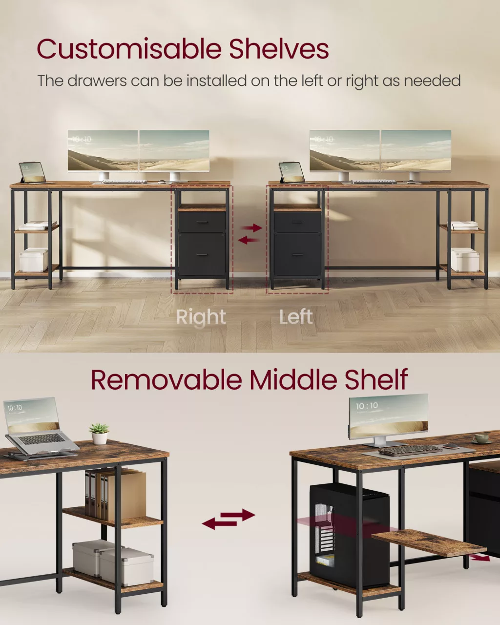 VASAGLE LWD105K01 számítógépes íróasztal 3 polccal és 2 fiókkal rusztikus barna és matt fekete