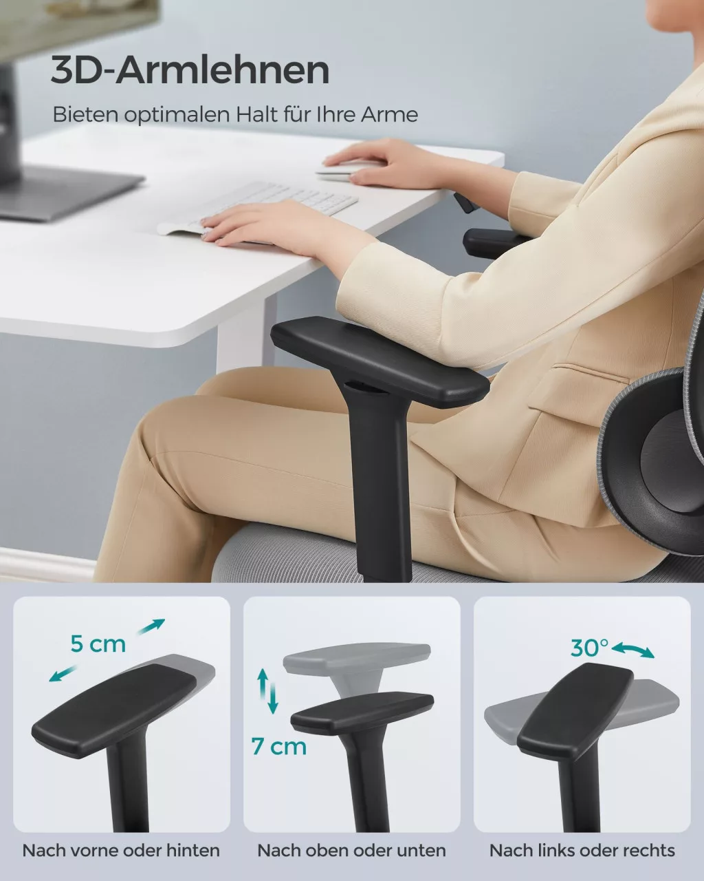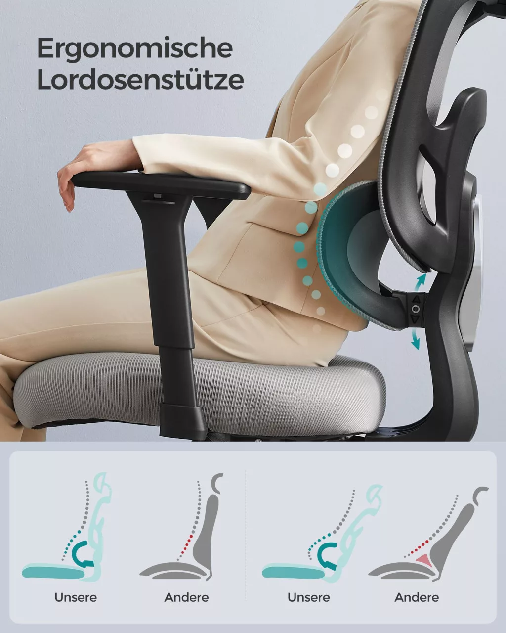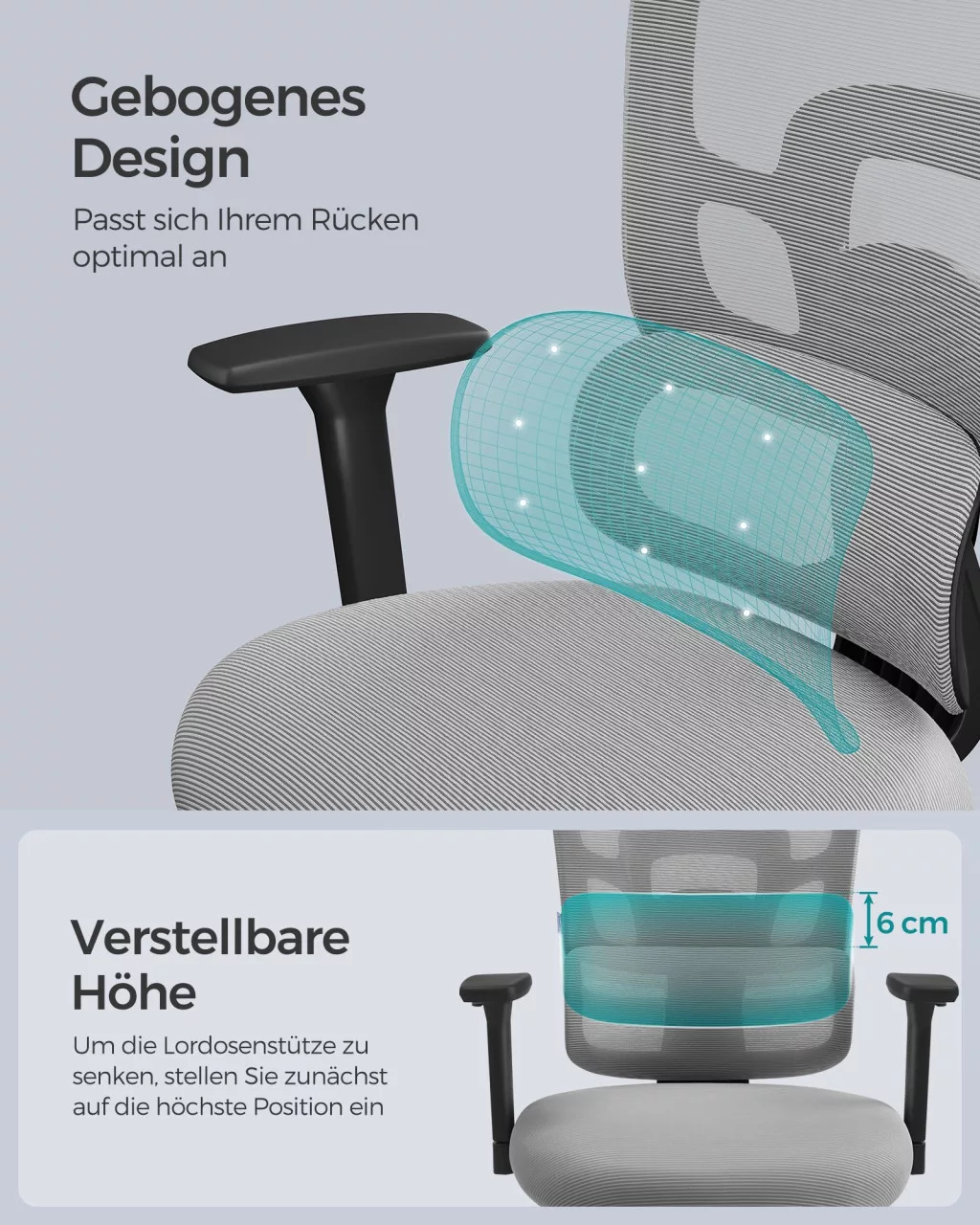 A SONGMICS irodai szék S-alakú háttámlája tökéletesen illeszkedik a gerinc természetes görbületéhez, míg az állítható deréktámasz extra támaszt nyújt a hát alsó szakaszának. A 6 cm vastag, kiváló minőségű habszivacs ülőpárna és a légáteresztő hálós kialakítás hosszú távon is kényelmes ülést biztosít.