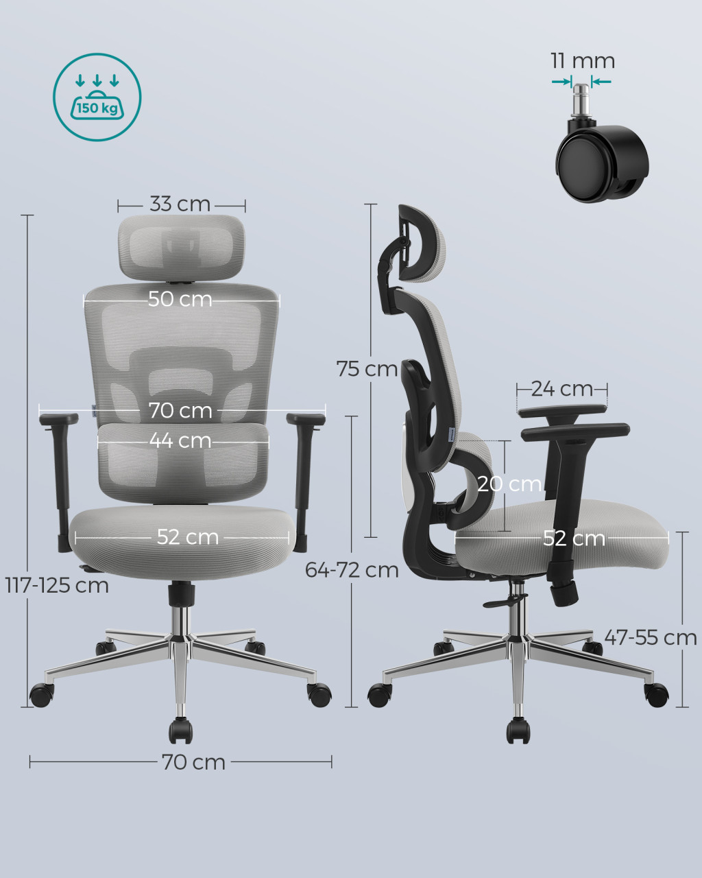 A szék számos állítási lehetőséggel rendelkezik: az ülésmagasság, a deréktámasz pozíciója és a dőlésszög is személyre szabható. A helytakarékos kialakításnak köszönhetően a karfák felhajthatók, így a szék könnyedén betolható az íróasztal alá.