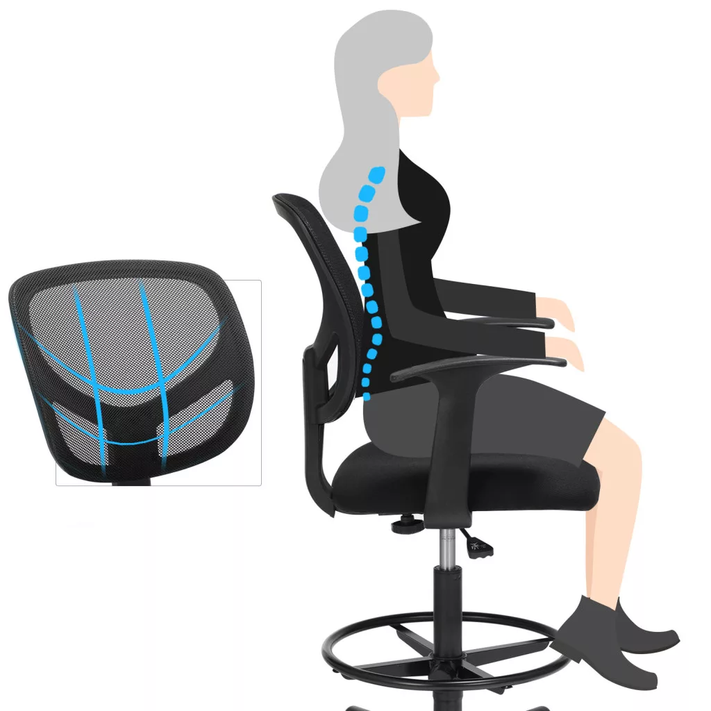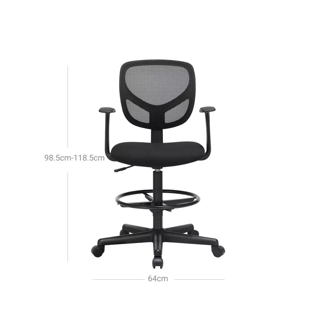 Ergonomikus kialakítású, magasított irodai szék állítható lábtámasszal és karfával, amely tökéletes megoldást nyújt magas munkaasztalokhoz és pultokhoz.