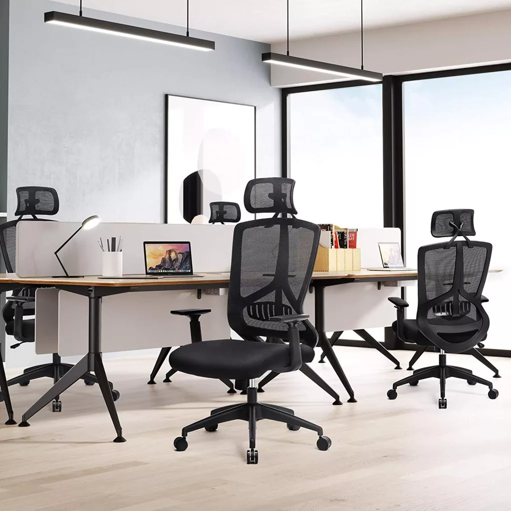 Teljesen állítható, ergonomikus irodai szék hálós háttámlával, deréktámasszal és fejtámlával a kényelmes munkavégzésért.