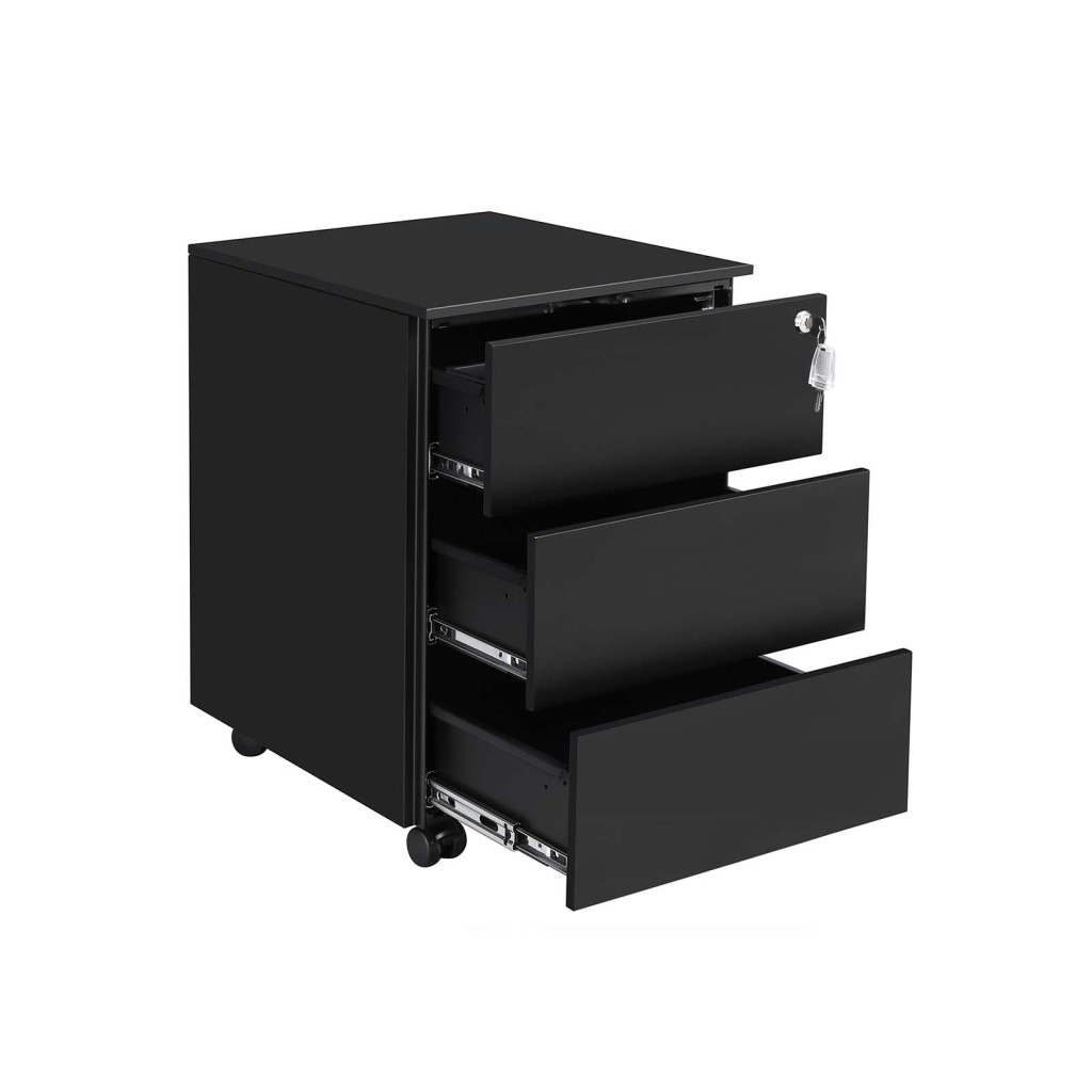 Ez a matt fekete, acél görgős konténer egyesíti a funkcionalitást és az elegáns megjelenést. A három tágas fiók teljes kihúzhatósága és a központi zár biztosítja dokumentumai biztonságos tárolását, míg a beépített szervező tálca segít a kisebb irodaszerek rendszerezésében.