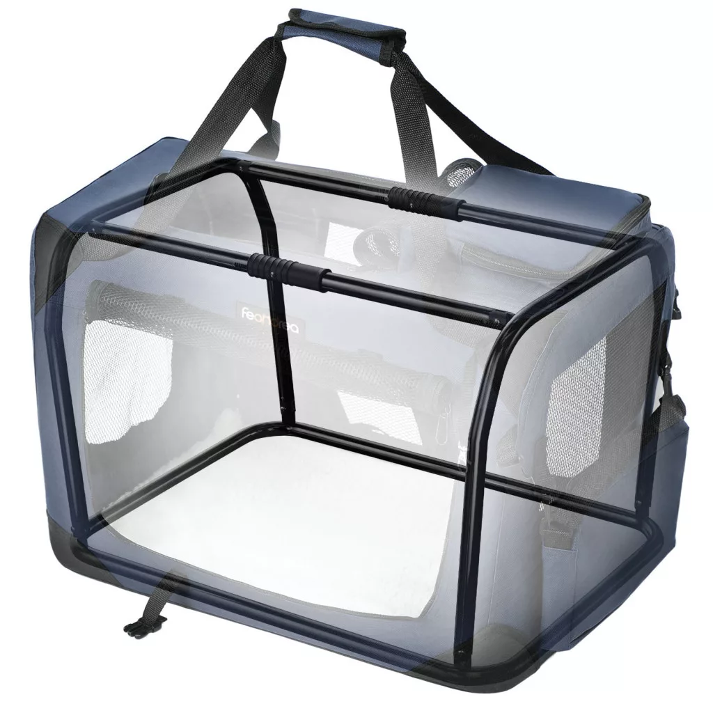 A három oldalon található hálós szellőzőnyílások optimális légáramlást és kilátást biztosítanak, így kisállata nem érzi magát bezárva. A praktikus oldalsó zsebekben kényelmesen tárolhatók a kisállat kellékei, míg az összecsukható kialakítás megkönnyíti a tárolást használaton kívül.