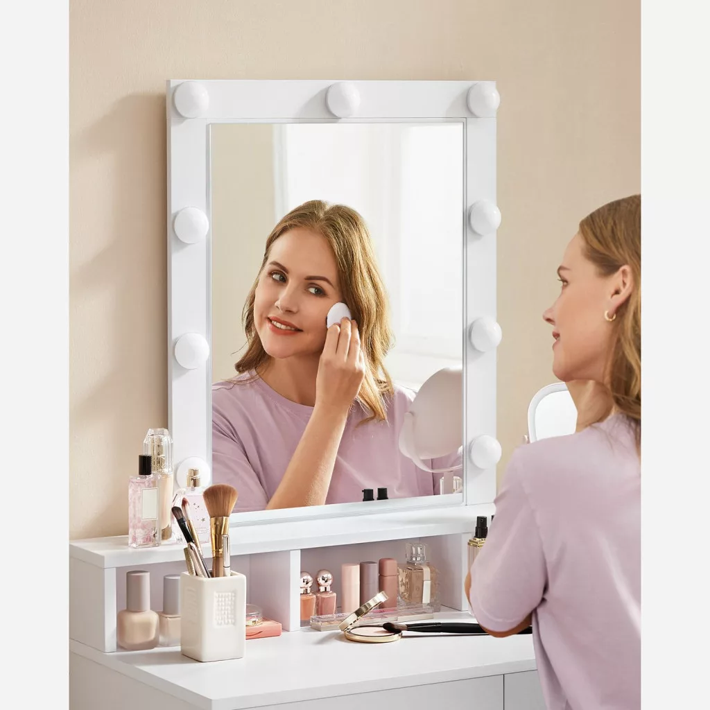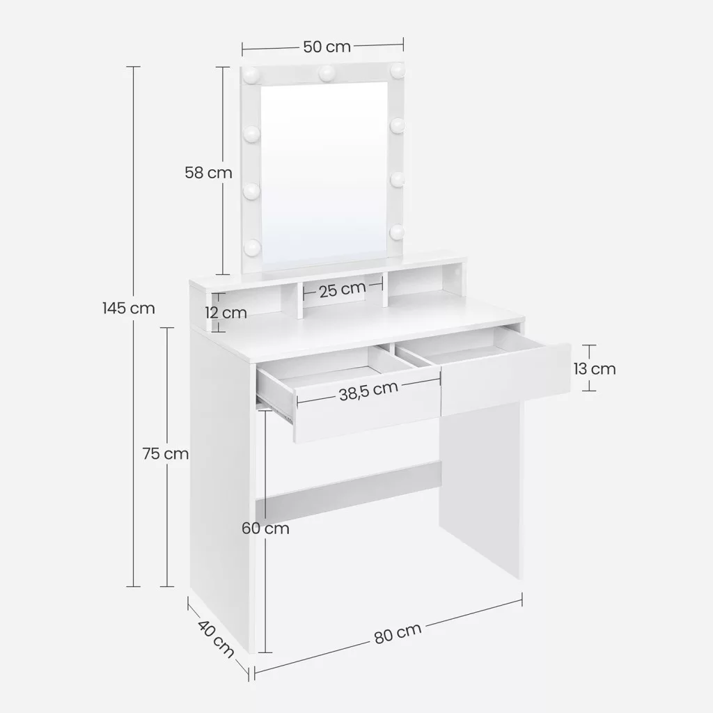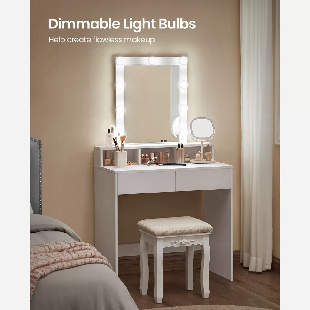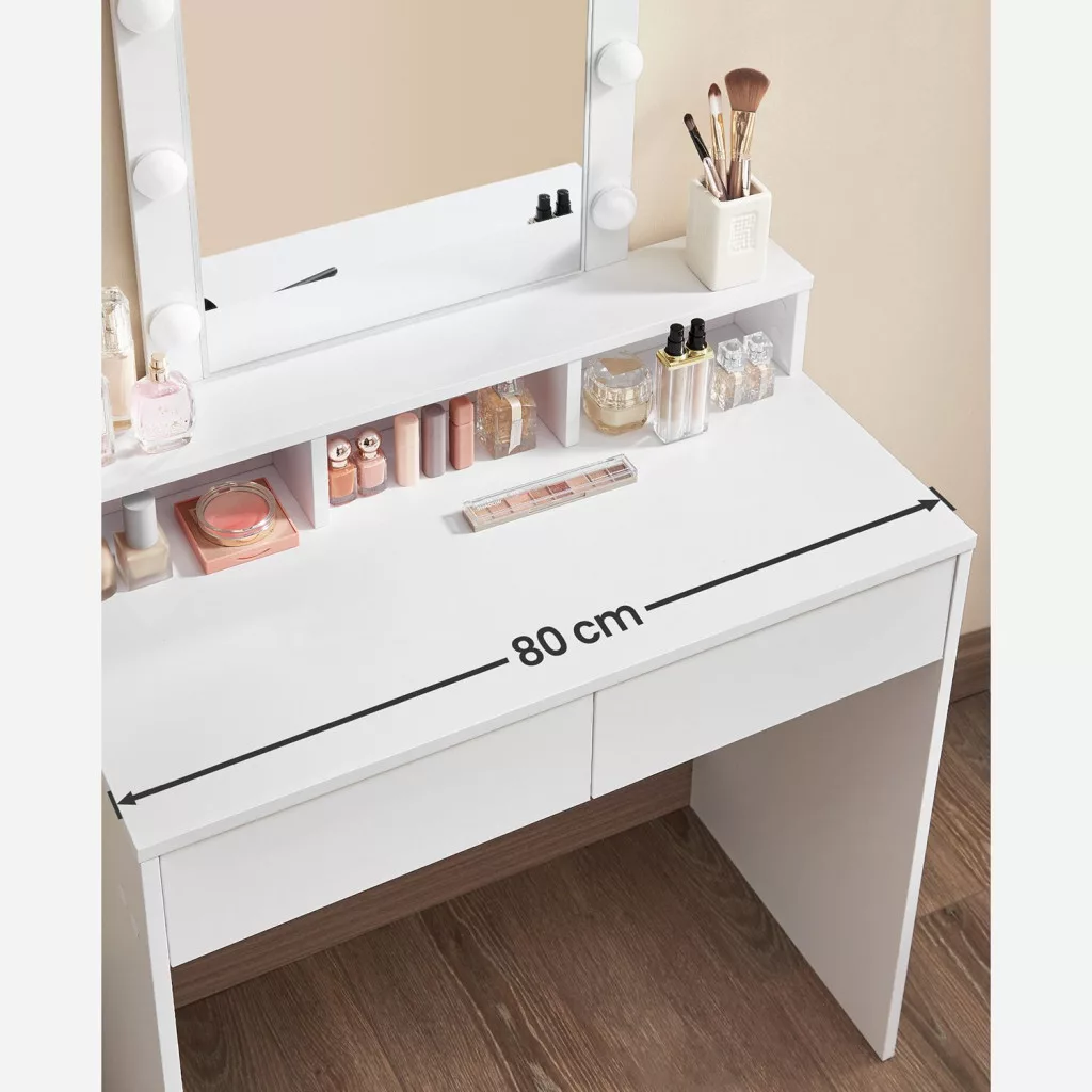 Modern fésülködőasztal 9 szabályozható LED izzóval, 2 tágas fiókkal és 3 nyitott tárolórekesszel, tökéletes sminkezéshez és szépségápolási rutinhoz.