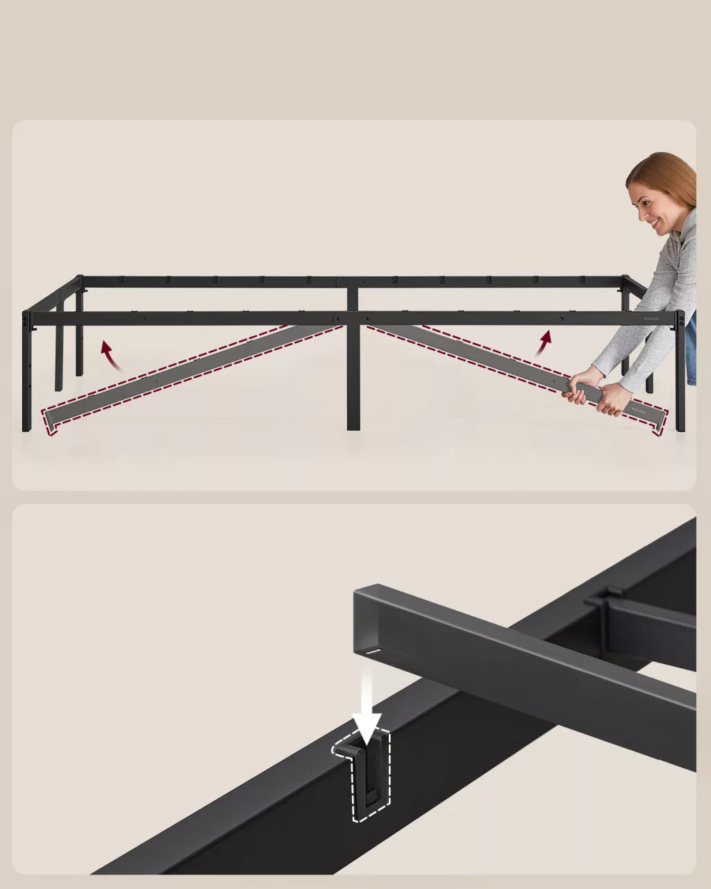 A VASAGLE matt fekete fém ágykeret tökéletes választás azok számára, akik a minimalista eleganciát és a praktikumot egyaránt értékelik. A masszív acél szerkezet és a 9 láb biztosítja a kivételes stabilitást, miközben a tiszta vonalvezetés és a fekete szín bármilyen hálószoba stílusához illeszkedik. Az ágy alatt található 31,6 cm magas tér ideális tárolódobozok elhelyezésére, így maximálisan kihasználhatja a rendelkezésre álló helyet.