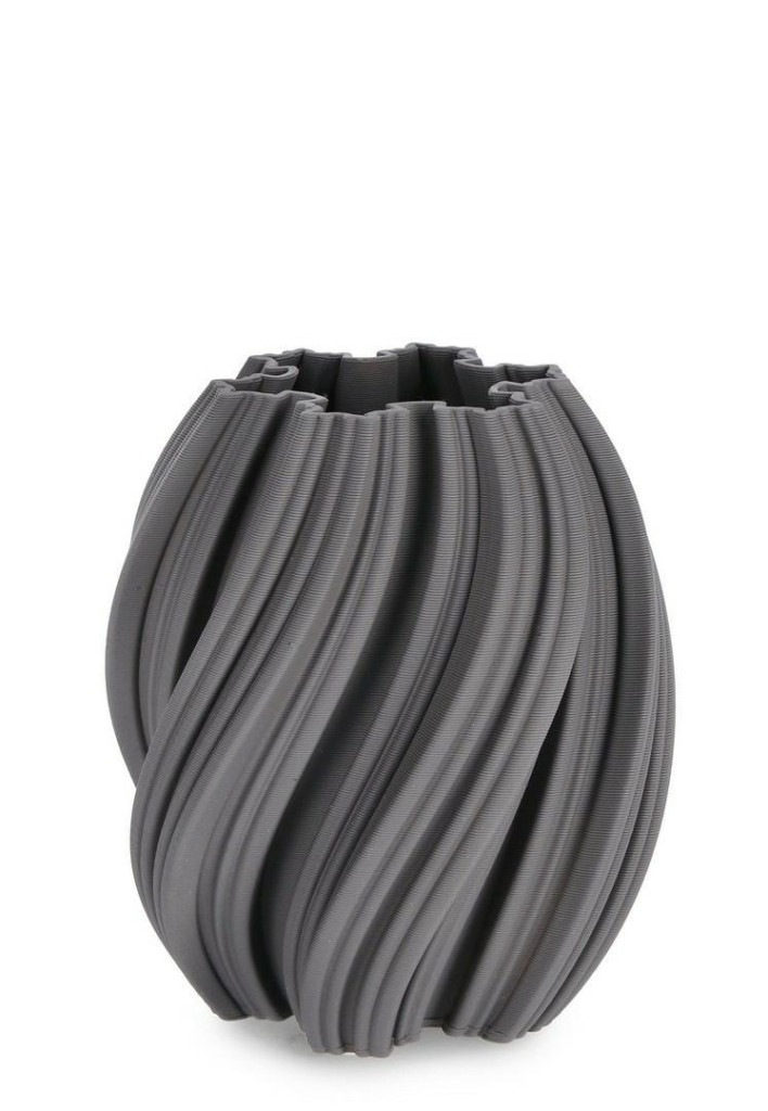Modern technológiával készült, egyedi megjelenésű kerámia váza csavart bordázattal, amely elegáns kiegészítője lehet bármely enteriőrnek.