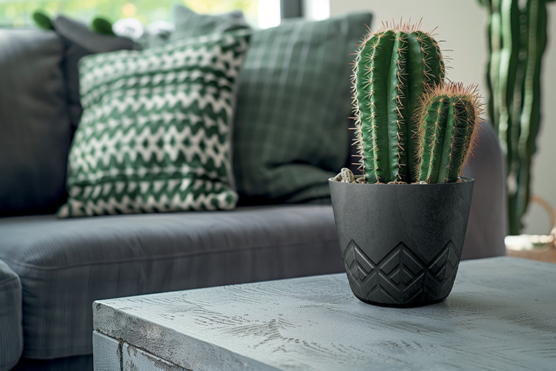 Modern, beton hatású műanyag kaspó geometrikus mintázattal, amely tökéletes választás kaktuszok és más szobanövények stílusos megjelenítéséhez.