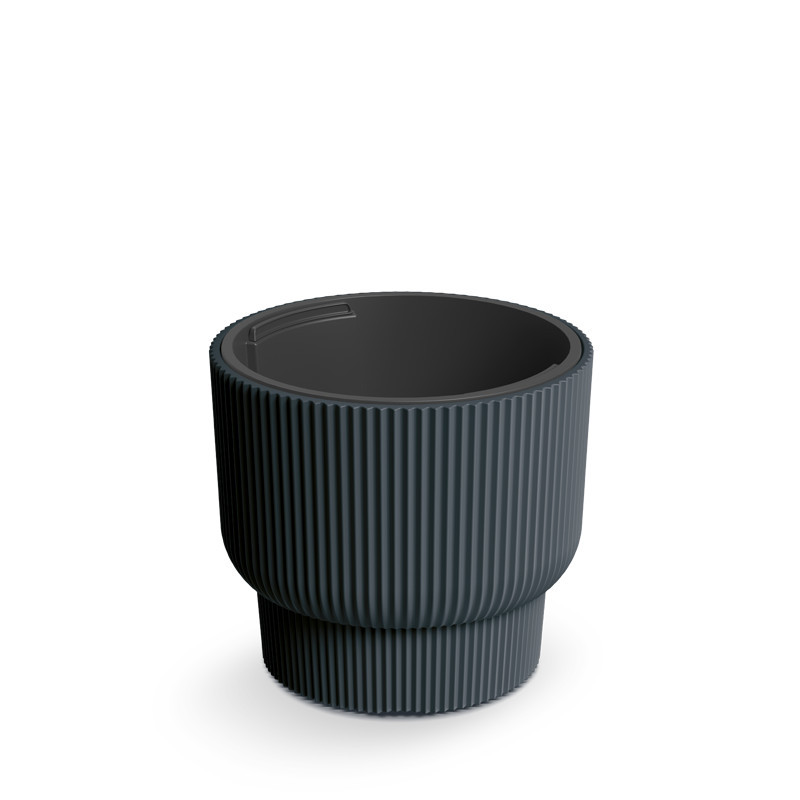 Modern, bordázott felületű antracit virágtartó kivehető betéttel, amely tökéletes választás teraszok és kertek stílusos díszítéséhez.
