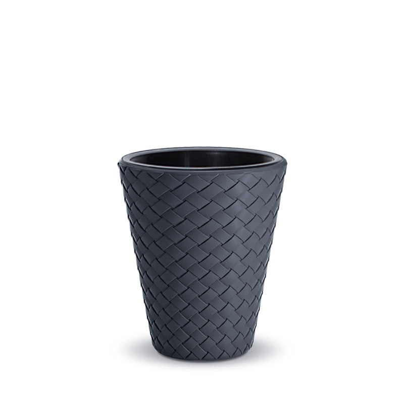 Elegáns, fonott mintázatú műanyag kaspó antracit színben, amely tökéletes választás mind beltéri, mind kültéri növények számára.