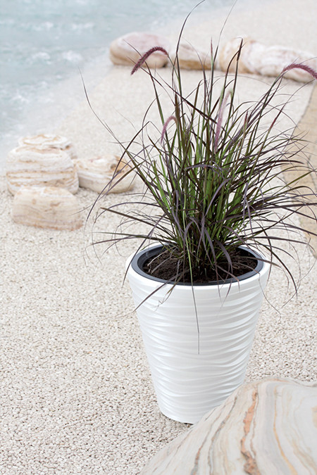 Elegáns, homokdűne mintázatú kaspó időtálló anyagból, amely tökéletes választás mind beltéri, mind kültéri növények számára.
