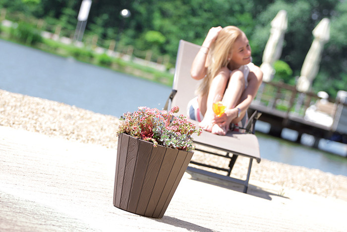 Elegáns, fa mintázatú kültéri virágtartó, amely tökéletes választás teraszok és kertek dekorálásához. Nagy űrtartalmának köszönhetően ideális nagyobb növények számára is.