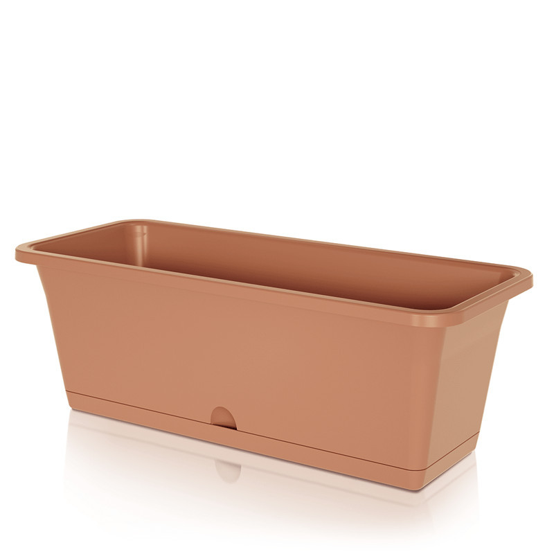 Strapabíró, elegáns terrakotta színű műanyag balkonláda 15,5 literes űrtartalommal, ideális erkélyek és teraszok növényeinek.