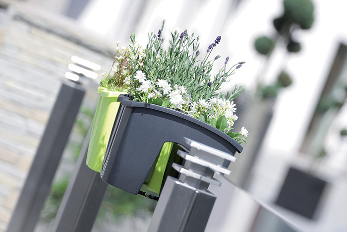 Innovatív erkélykorlát virágtartó speciális rögzítő kialakítással, amely nem igényel további szerelést vagy kiegészítőket.