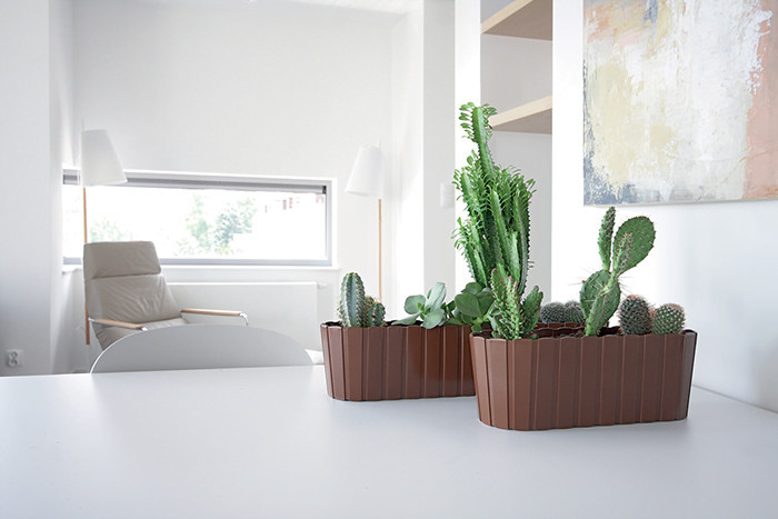 Elegáns, bordázott kialakítású műanyag virágláda, amely tökéletes választás kaktuszok és pozsgások számára, modern és minimalista enteriőrökben.