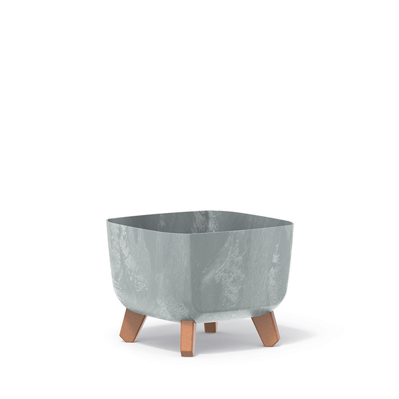 Modern, beton hatású négyzetes virágtartó beépített vízelvezetéssel és fa hatású lábakkal, tökéletes választás szobanövényekhez és bonsaiokhoz.