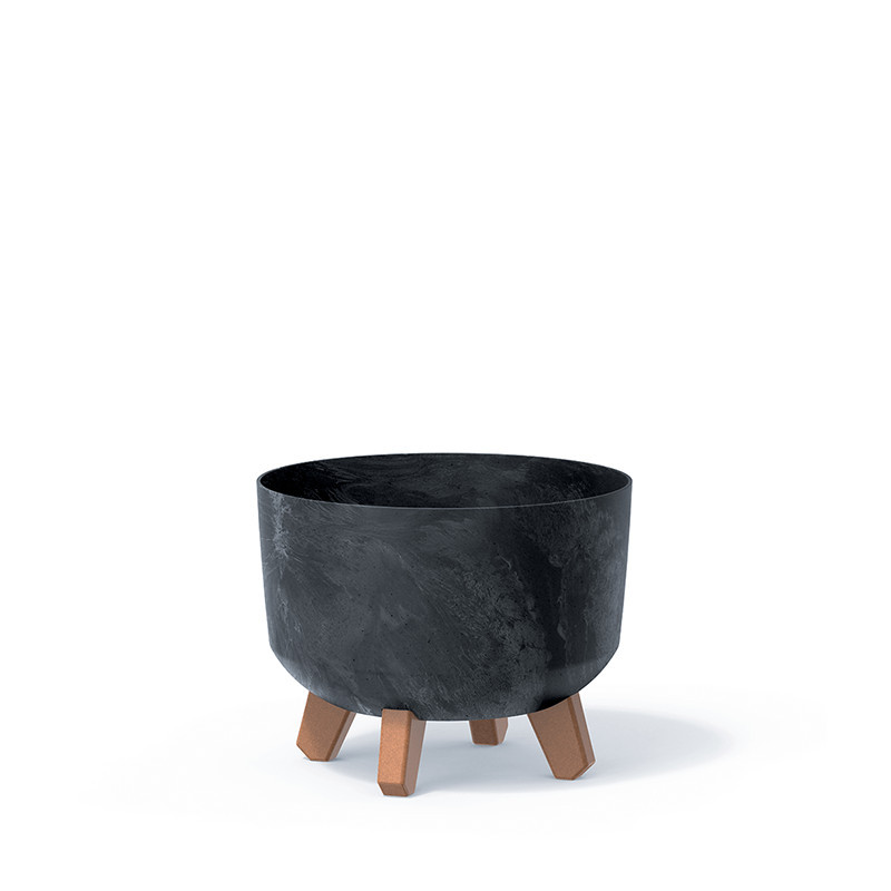 Az antracit színű kaspó 23,8 cm átmérőjével ideális méretű a legtöbb szobanövény számára. A fa lábak nem csak dekoratív elemként szolgálnak, de megemelik a növényt, és védik a padlót a nedvességtől.