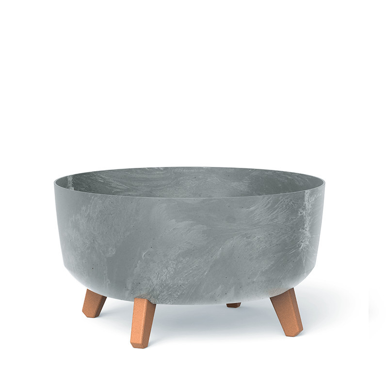 Modern, beton hatású alacsony virágtartó fa lábakkal, amely tökéletesen ötvözi a kortárs dizájnt a klasszikus elemekkel.