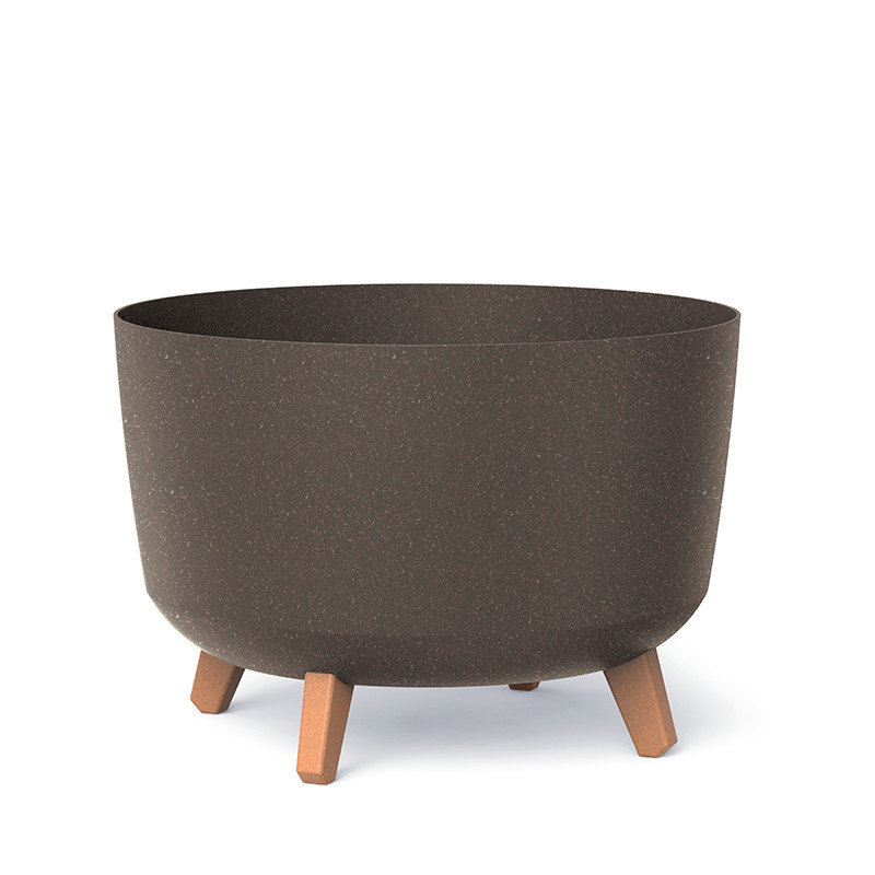 Modern, környezetbarát virágtartó 33% természetes faalapanyag tartalommal, stílusos fa lábakkal és kávébarna színben.