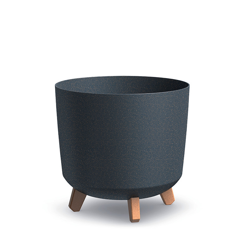 Modern, környezetbarát virágtartó 33% faalapanyag tartalommal, egyedi fa mintázatú lábakkal és beépített vízelvezetési rendszerrel.
