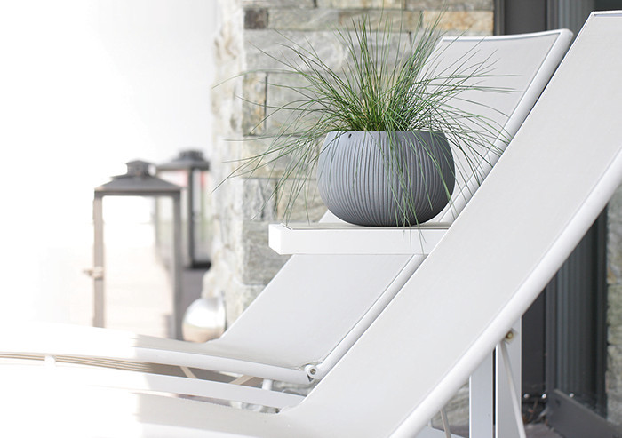 Modern, gömb alakú beton kaspó egyedi bordázott felülettel, amely tökéletes választás pozsgások és kisebb szobanövények számára.