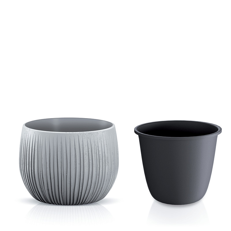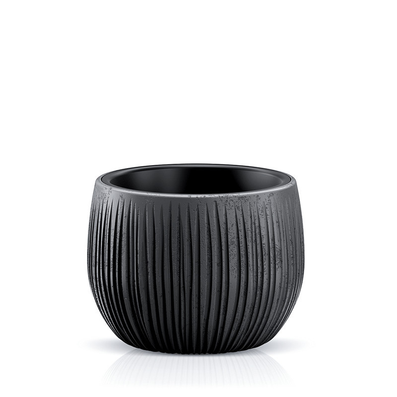 Ez a különleges, gömb alakú beton kaspó egyesíti a klasszikus kerámiák szépségét a modern anyaghasználattal. A kézzel készített hatást keltő, függőleges bordázat egyedi textúrát és játékos fény-árnyék hatást kölcsönöz a terméknek. A matt fekete felület kiemeli a bordázat plasztikusságát.