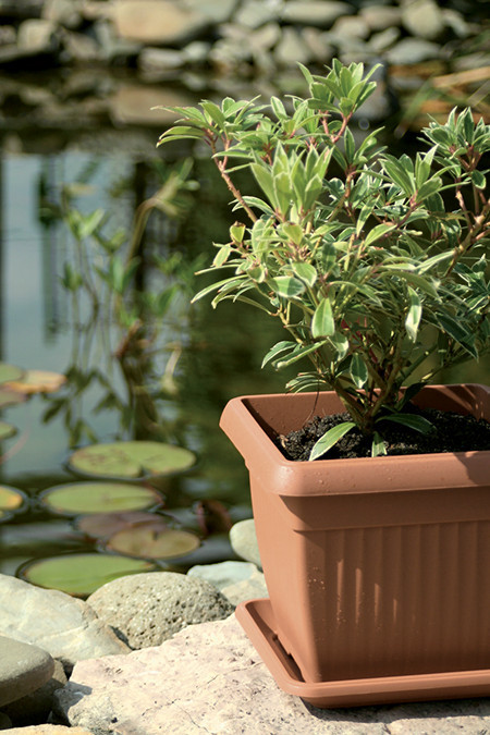 A Terra négyzetes virágcserép kiváló minőségű műanyagból készült, amely egyesíti a klasszikus terrakotta megjelenést a modern anyagok tartósságával. A bordázott oldalfal nem csak dekoratív, de szerkezeti stabilitást is biztosít, miközben segíti a gyökerek megfelelő szellőzését.