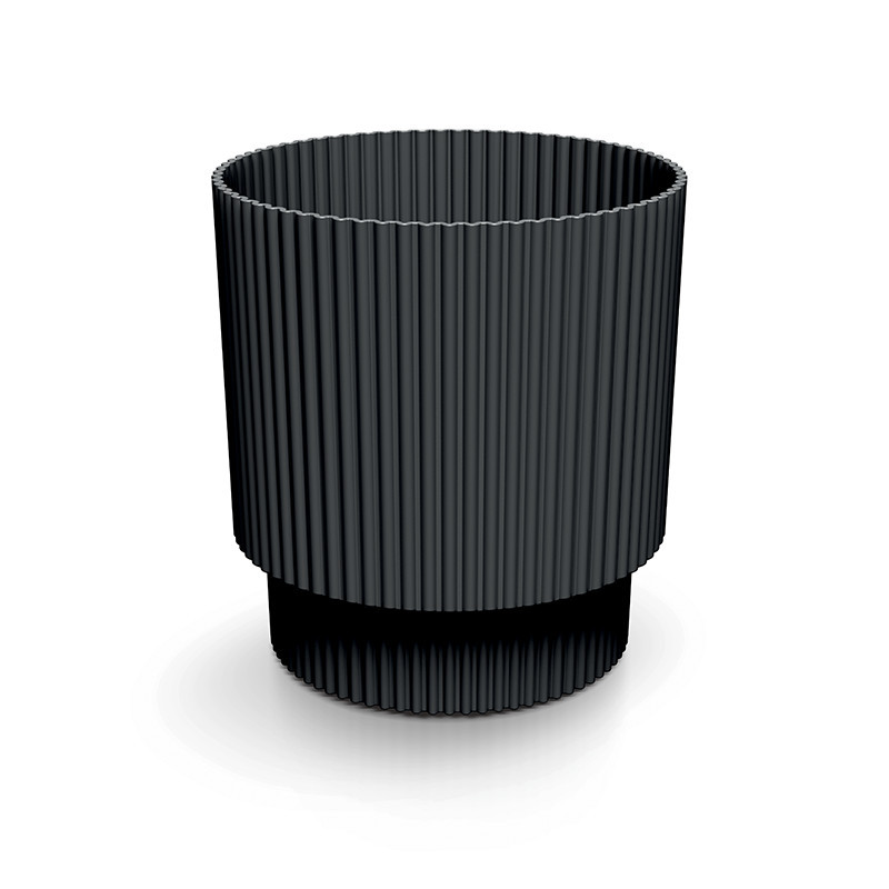 A Milly Round kaspó egyedi, függőleges bordázatával és kifinomult hengeres formájával különleges megjelenést kölcsönöz növényeinek. A keskenyebb alsó gyűrű és a szélesebb felső rész harmonikus összhangot alkot, míg a szénfekete szín időtlen eleganciát sugároz.