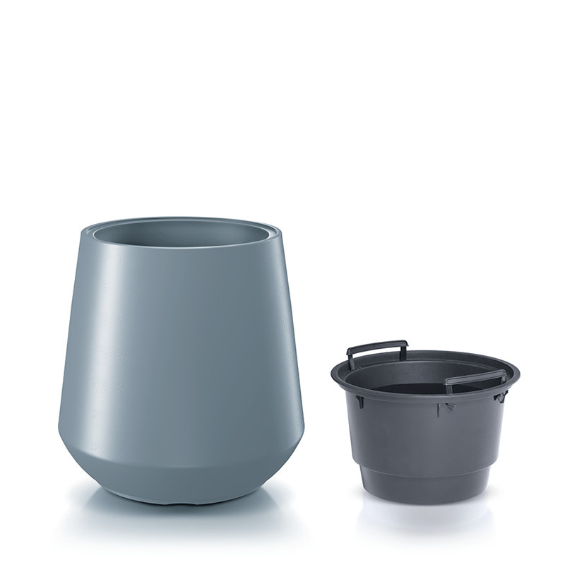 Modern vonalvezetésű, nagyméretű kültéri virágcserép kivehető betéttel és praktikus vízelvezető rendszerrel.