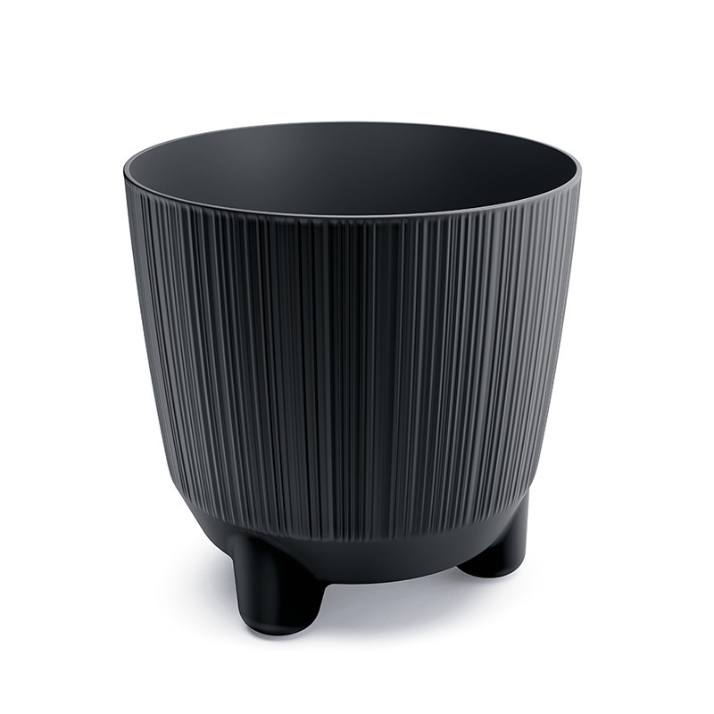 Modern, bordázott kialakítású virágtartó stabil lábakkal, amely tökéletes választás beltéri növények számára. Az antracit szín és az elegáns vonalvezetés bármely enteriőrbe harmonikusan illeszkedik.