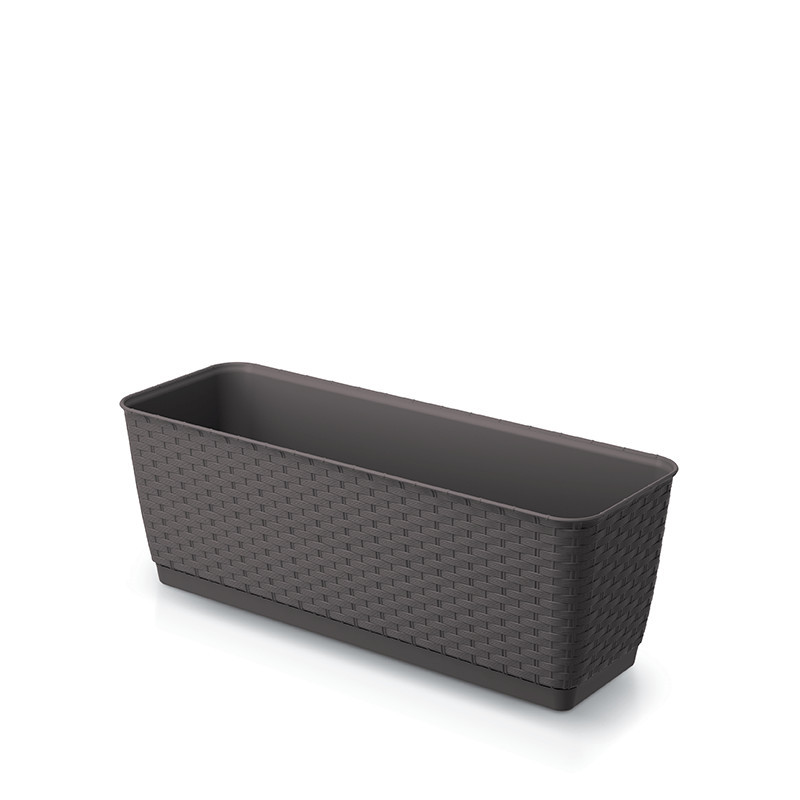 Elegáns, rattan hatású műanyag virágláda beépített öntözőrendszerrel, amely tökéletes megoldást nyújt erkélyek és teraszok díszítéséhez.
