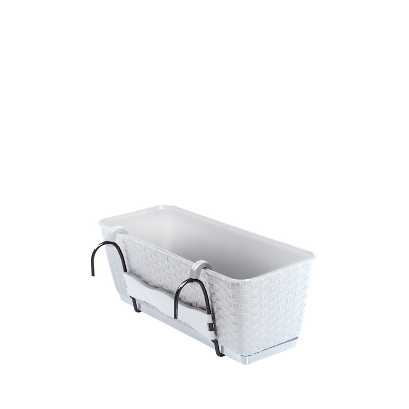 Stílusos erkélyláda beépített öntözőrendszerrel és rattan hatású felülettel, tökéletes megoldás erkélyek és teraszok díszítésére.