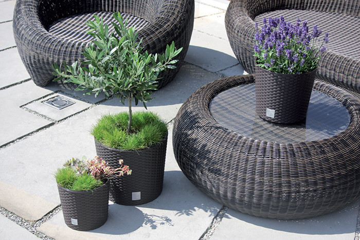 Elegáns, rattan hatású műanyag kaspó beépített betéttel, amely tökéletes választás mind beltéri, mind kültéri növények számára.