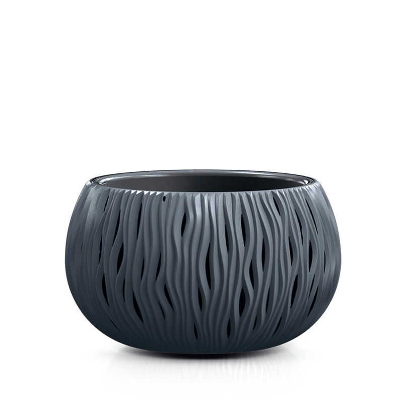 A Sandy Bowl virágtartó sorozat különleges darabja ez az antracit színű, 37 cm átmérőjű kaspó, amely a kézzel formázott kerámia edények szépségét idézi. A felületét díszítő hullámmintázat játékosan töri meg a fényt, ezáltal különleges árnyékhatást keltve a környezetében.