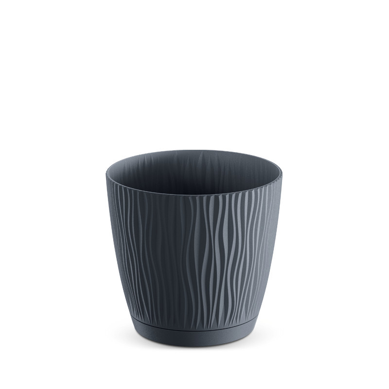 A Sandy kollekció antracit színű virágtartója egyedi, függőleges hullámmintázatával a sivatagi homokdűnék természetes szépségét idézi. A modern formatervezés és a praktikus kialakítás tökéletes összhangot teremt, miközben a beépített önzáró alátétrendszer megakadályozza a felesleges vízkifolyást.