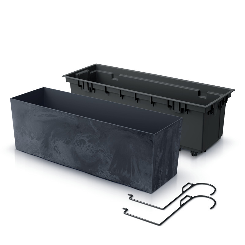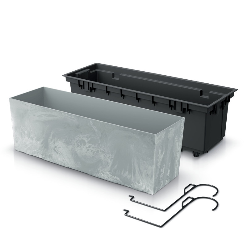 Modern, beton hatású műanyag virágláda beépített védőbetéttel és tartókonzolokkal, tökéletes választás erkélyekre és teraszokra.