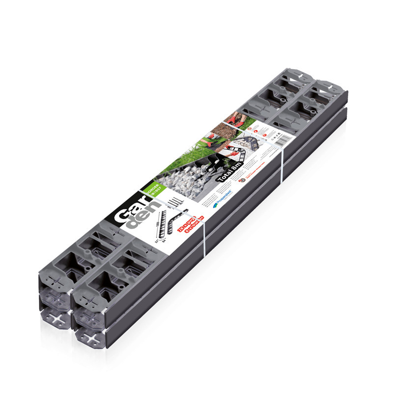 Professzionális műanyag ágyásszegély 8 méteres hosszúságban, amely tökéletes megoldást nyújt kertek és ágyások elhatárolására.