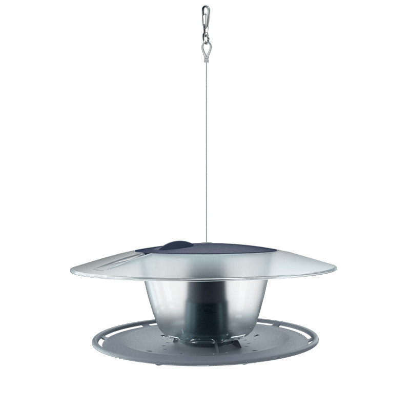 Modern kialakítású, időjárásálló madáretető nagy etetőtérrel, amely tökéletes megoldás kis- és nagytestű madarak etetéséhez.