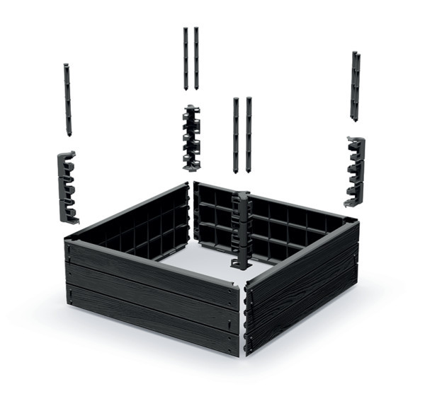 A Base Woody magaságyás rendszer egyesíti a funkcionalitást és az esztétikumot. A faerezetes felületű, időjárásálló műanyagból készült elemek könnyen összeállíthatók, és tetszés szerint bővíthetők magasságban. Az egyedi rögzítőrendszer stabil szerkezetet biztosít, miközben a 25 cm-es magasság ideális a növények gyökérzetének fejlődéséhez.
