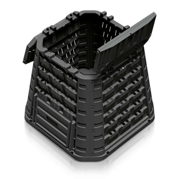 Könnyen összeállítható, 750 literes moduláris komposztáló rendszer UV-álló műanyagból, zárt fedéllel és kényelmes alsó ürítőnyílásokkal.