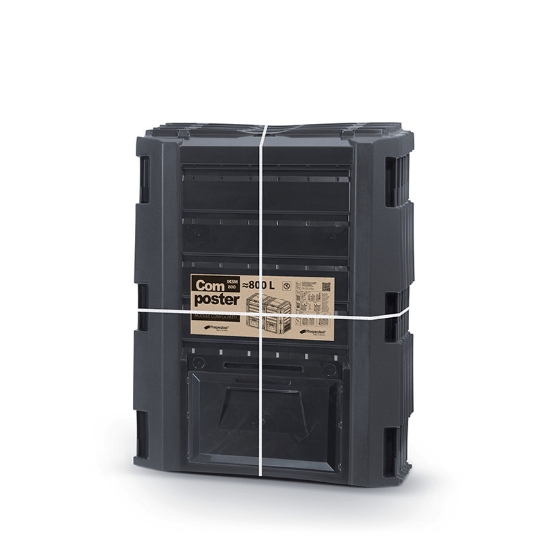 Nagy kapacitású, 800 literes moduláris komposztáló rendszer, amely tökéletes megoldást nyújt a háztartási zöldhulladék környezetbarát feldolgozására.