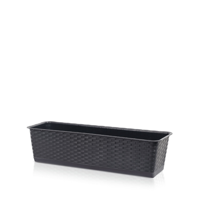Elegáns, rattan hatású műanyag balkonláda beépített öntözőrendszerrel, amely tökéletes választás erkélyek és teraszok díszítéséhez.