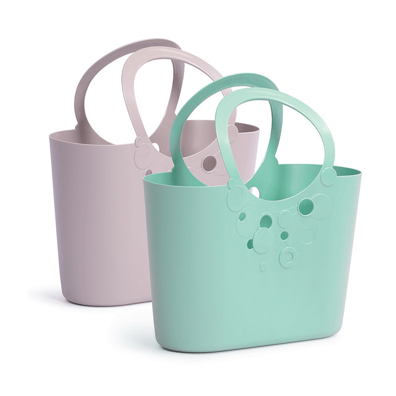 Stílusos, nagy kapacitású műanyag táska dekoratív buborékos mintázattal, zsálya színben. Ideális mindennapi használatra és tárolásra.