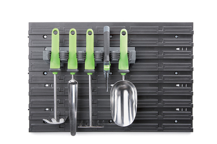 Sokoldalú fali szerszámtartó rendszer, amely tökéletes megoldást nyújt kerti és háztartási eszközök rendezett tárolására.