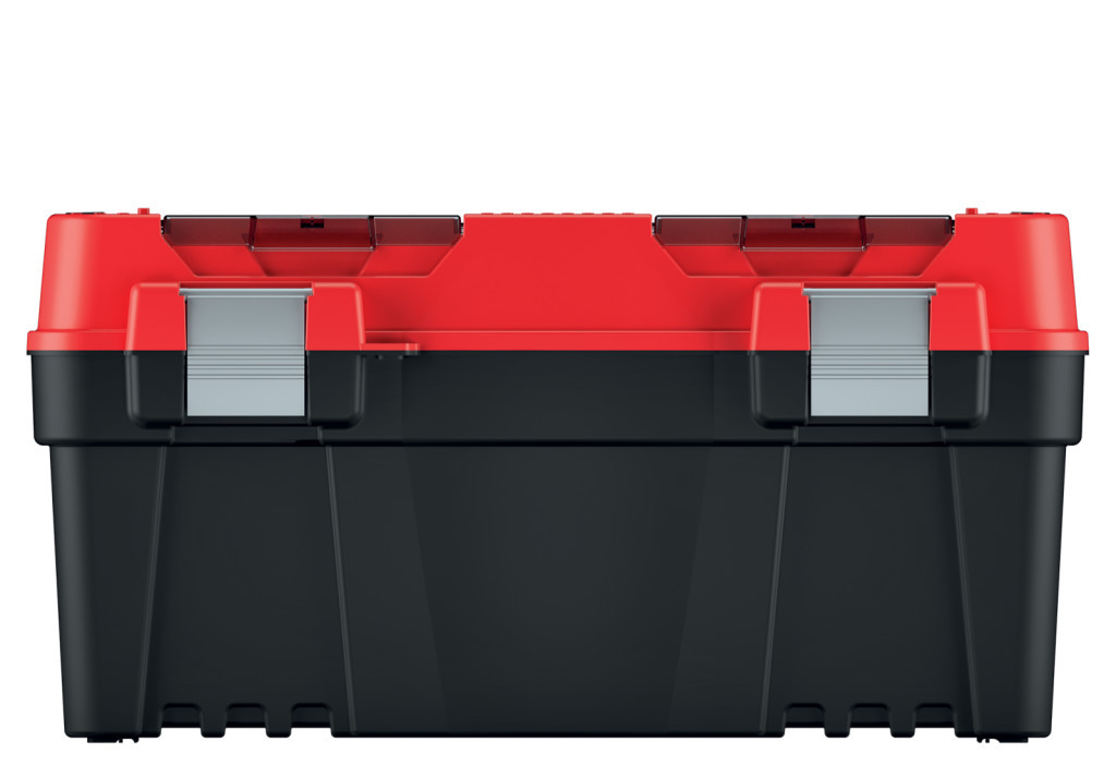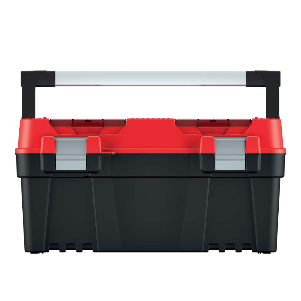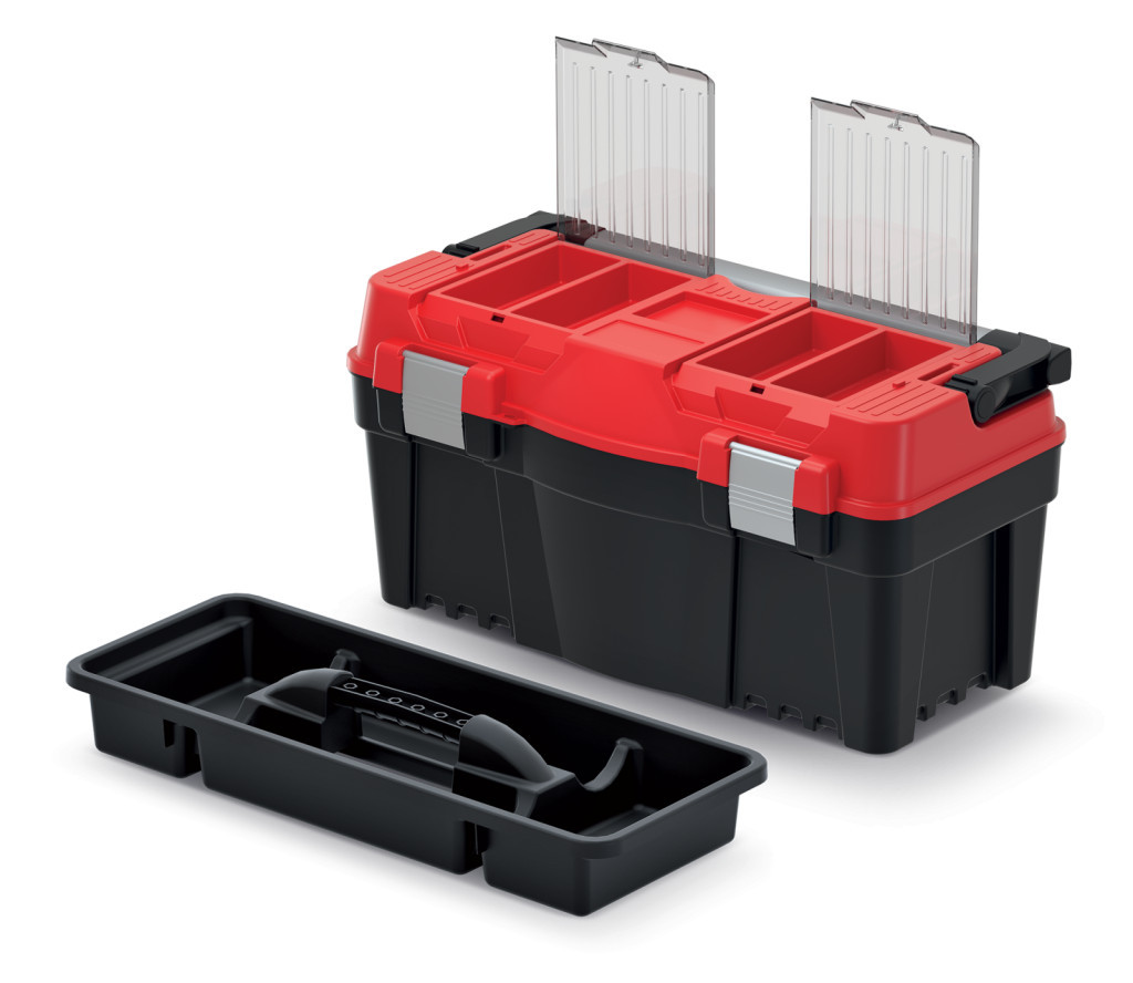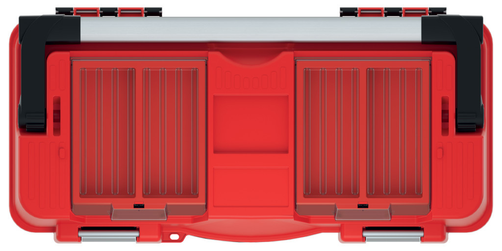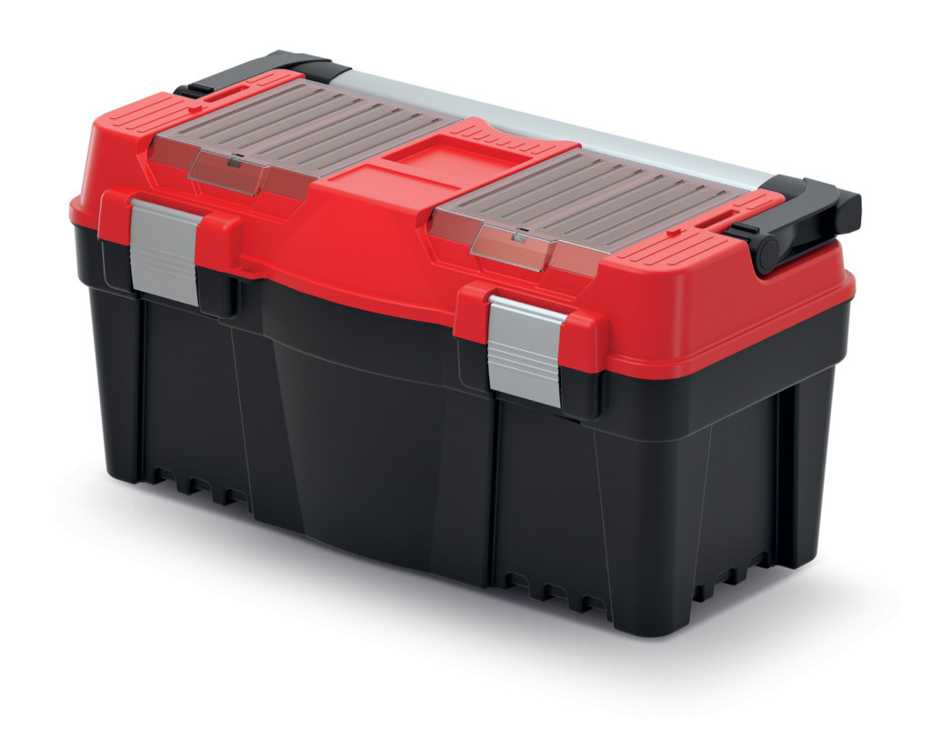 Strapabíró, 55 cm-es szerszámosláda dupla rendszerezővel és alumínium fogantyúval, akár 20 kg terhelhetőséggel.