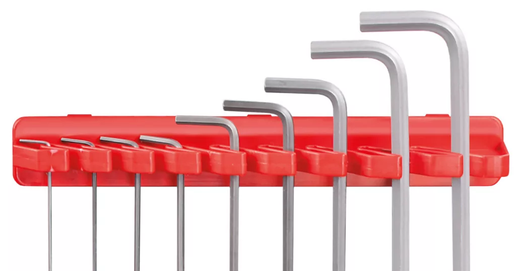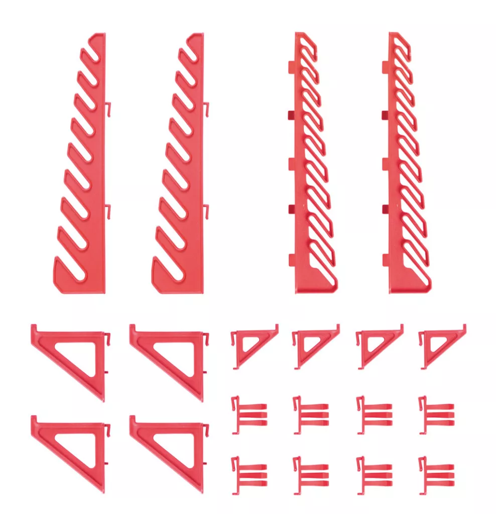 A tartós polimerből készült akasztók megbízható tartást biztosítanak, miközben védik a szerszámokat a sérülésektől. A piros színű akasztók nem csak praktikusak, de esztétikus megjelenést is kölcsönöznek a műhelynek.