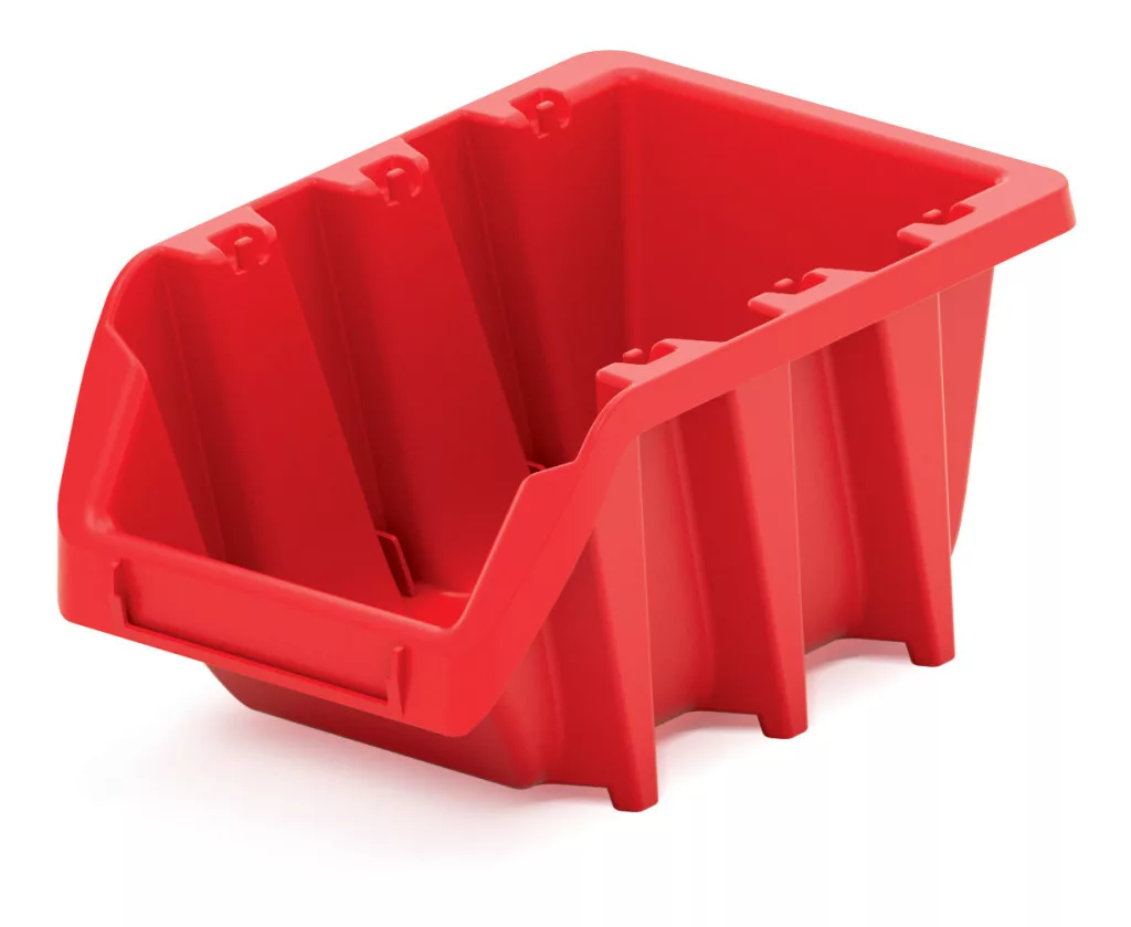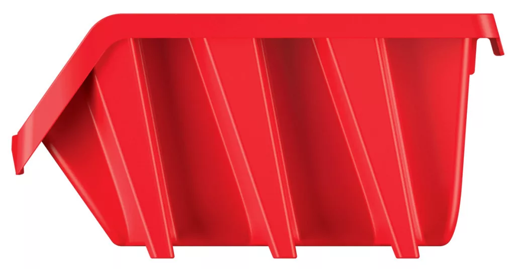Tartós polimer műhelytároló doboz falra szerelhető és egymásba rakható kivitelben, ideális alkatrészek és szerszámok rendszerezett tárolásához.